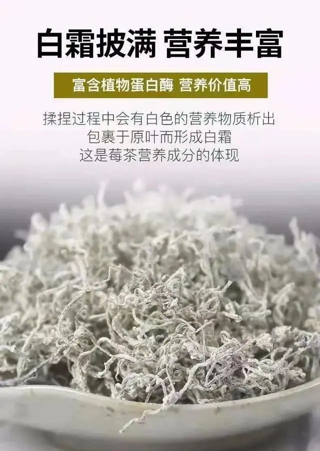 芽尖莓茶(又叫龍須茶)看形態(tài)是最細的芽尖,制成茶后形似龍須,梗比較少,表面白霜雪白,均勻,泡一杯出來,茶湯是清澈透亮的淡黃,很明顯能看到整株伸展的芽尖,喝下去是先苦后甘甜,茶越好回甘效果越好。